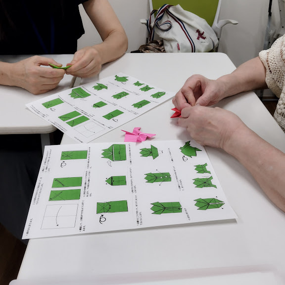現在5人の受講生が参加。この講座を受講したのち、乳幼児子育て中の家庭をボランティアで訪問し、親御さんの話を傾聴したりお子さんと遊んだりしてもらいます。講座の内容は傾聴の仕方や子どもの人権などいろいろ。今回は「協働」を体験するワークとして、2人で折り紙を折る、という作業をしてもらいました。