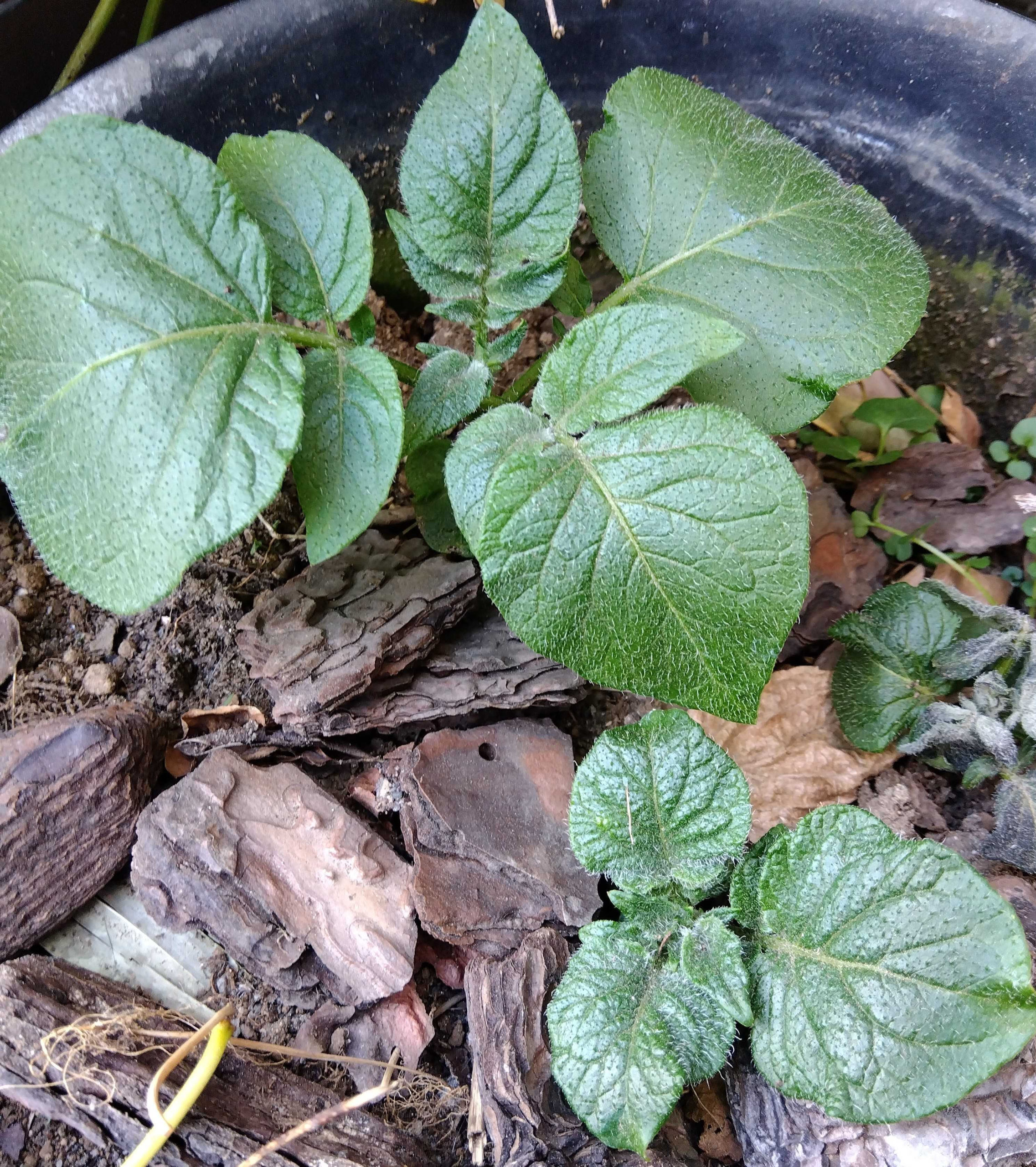 秋になり冬になり、みんなジャガイモの存在を忘れていた頃、掃除の時に邪魔になったので、外の雨ざらしの物置の上にチョンと放置したまま、私もまた忘れてしまっていました。そしてある日、そのジャガイモが風で落ちて玄関の外に転がっているのを見つけました。「ああ、もうダメになっちゃたかな」と思い拾い上げてみると、なんとジャガイモからびっしり根が生えて芽もいっぱい出ているではありませんか!!慌てて、玄関先の植木鉢に移しました。もう冬だし、このまま枯れてしまうのではと思いつつも、ふんわり土を被せて、また放置。